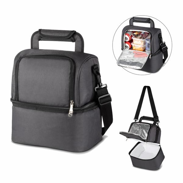 Bolsa térmica em tecido poliéster 600D, bolso frontal, alça de mão, alça de ombro regulável com 2 compartimentos térmicos, com capacidade de até 7 litros na parte superior (costurada) e 6 litros na parte inferior (soldada), interior parte superior em Polietileno e parte inferior em PEVA (Polietileno Vinil Acetato). Gravação da logomarca em 1 cor já inclusa.