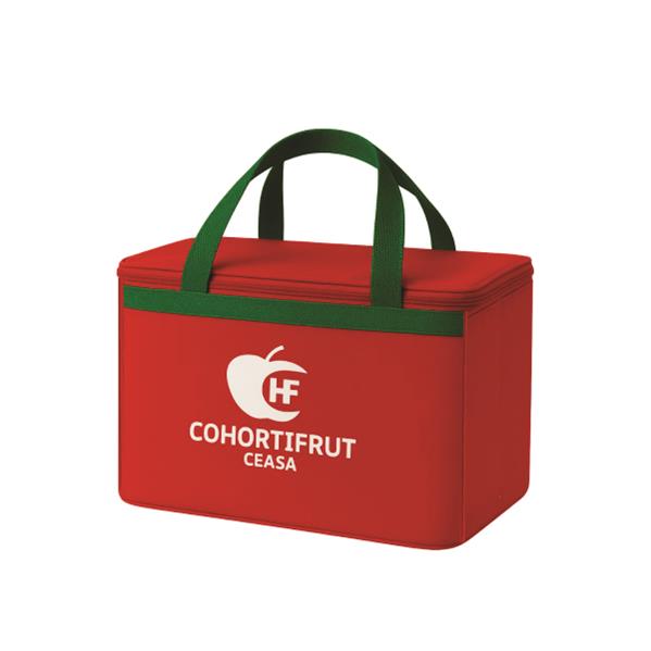 Bolsa térmica com capacidade para 18 litros com alça dupla de mão. Revestimento interno em PVC laminado. Disponível em várias cores. Gravação da Logomarca em 1 cor já inclusa.