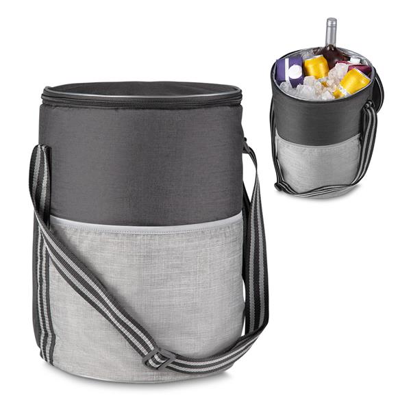 Bolsa térmica com capacidade de 26 litros. Fabricada em tecido nylon mescla 300D, possui bolso frontal e alça de ombro regulável. Parte interna soldada que pode reter líquidos. Gravação da logomarca em 1 cor já inclusa.