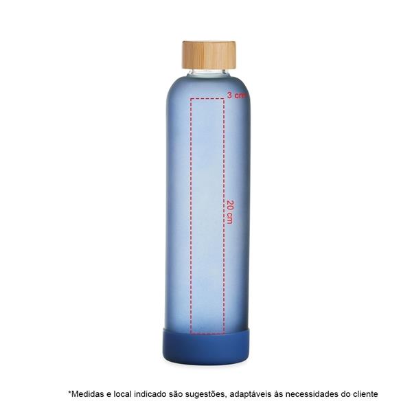 Garrafa com capacidade de 1 litro, feita em vidro borossilicato, conhecido pela resistência e durabilidade, capaz de suportar variações de temperatura, podendo ser levada à geladeira. Conta com tampa rosqueável de bambu e protetor anti-impacto removível em silicone. Gravação da logomarca em 1 cor já inclusa.
